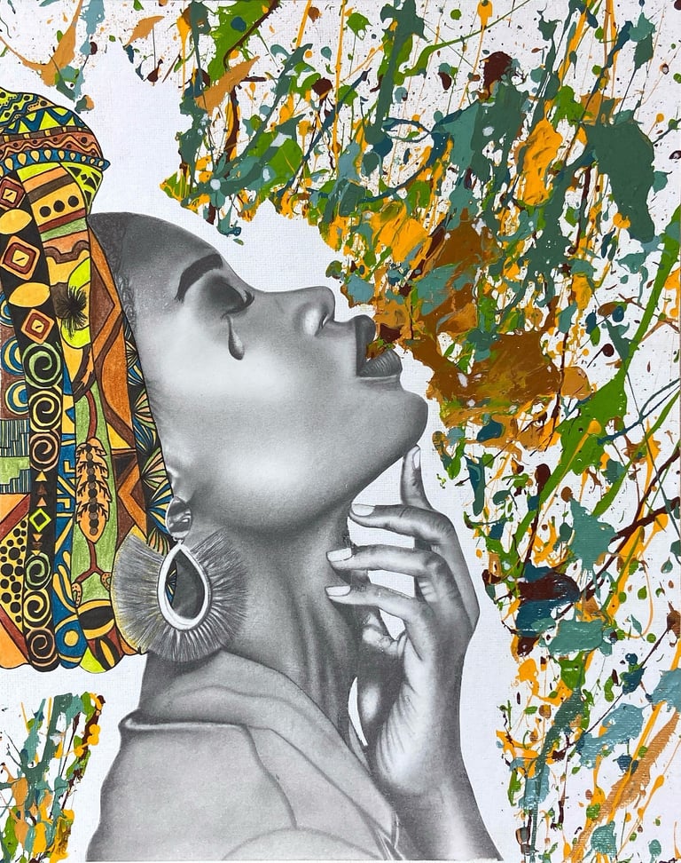 Cette image est celle d'une femme racisée soufflant des éclats de peinture colorés évoquante une scène vibrante.